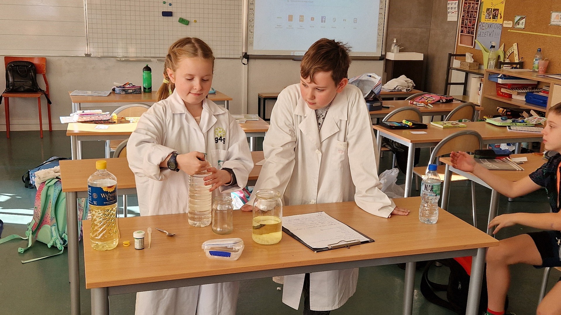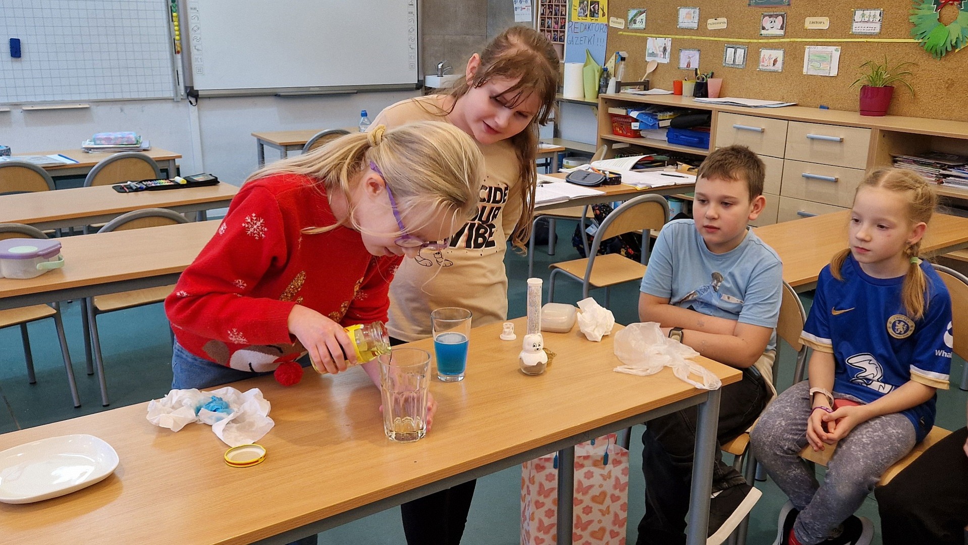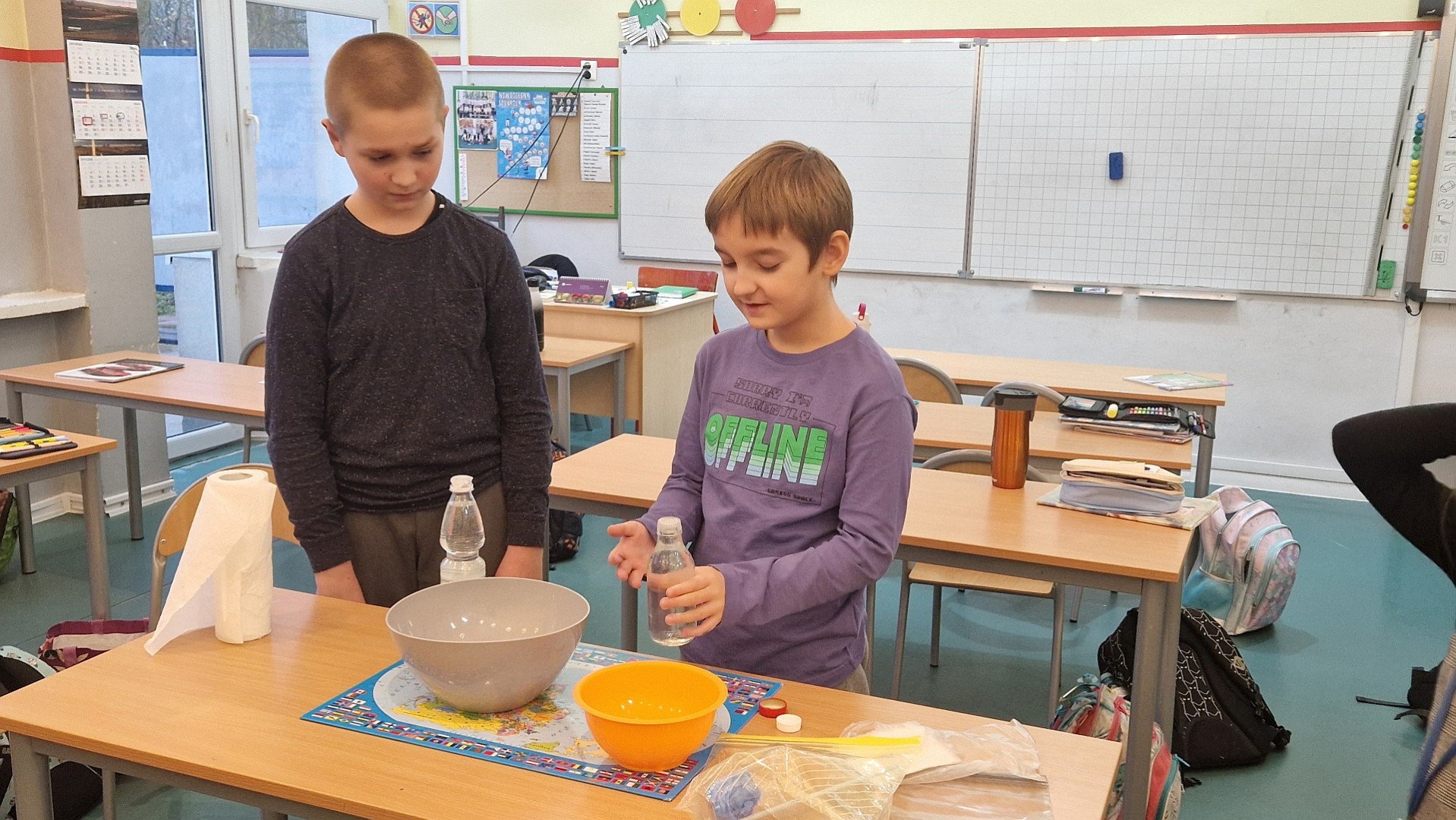 Uczniowie klasy 3c regularnie wykonują różne eksperymenty w ramach zajęć rozwijających ich zainteresowania i uzdolnienia. Podczas lekcji badają właściwości wody, tworzą domowe wulkany z sody i octu oraz eksperymentują z magnetyzmem. Dzięki tym doświadczeniom uczą się poprzez zabawę i zdobywają praktyczną wiedzę o otaczającym świecie. Samodzielnie formułują wnioski i zadają pytania. Uczniowie z dużym zaangażowaniem biorą udział w zajęciach i czerpią radość z odkrywania nowych zjawisk. Takie eksperymenty rozwijają ich ciekawość, kreatywność i umiejętność logicznego myślenia.