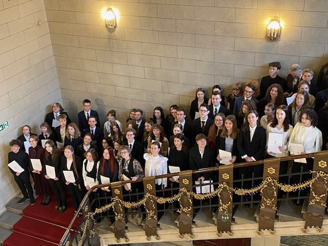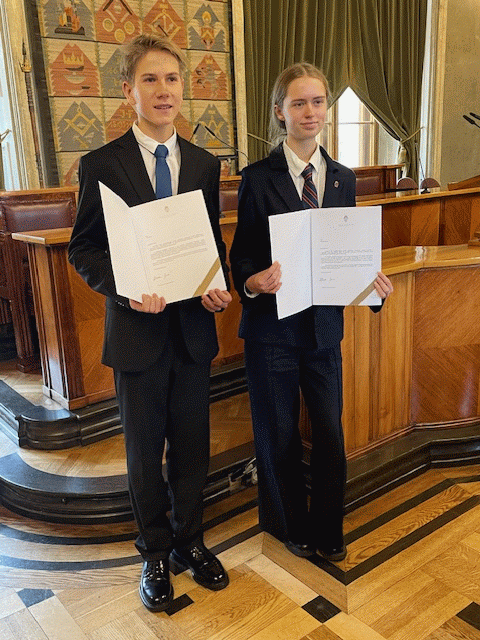 27 listopada 2025 r. w Sali Obrad Urzędu Miasta Krakowa miała miejsce uroczystość wręczenia nagród dla Absolwentów szkół, którzy zdobyli najwyższe wyniki w Krakowie z egzaminu ósmoklasisty, matur i egzaminów zawodowych. Naszą Szkołę reprezentowały aż dwie osoby (spośród 20 wyróżnionych). Alicja Rucińska i Jan Bobak odebrali nagrodę z rąk Pana Aleksandra Miszalskiego – Prezydenta Miasta Krakowa i Pani Marii Klaman – Zastępcy Prezydenta za 100% wyniki we wszystkich częściach egzaminu ósmoklasisty: z języka polskiego, języka angielskiego i matematyki.