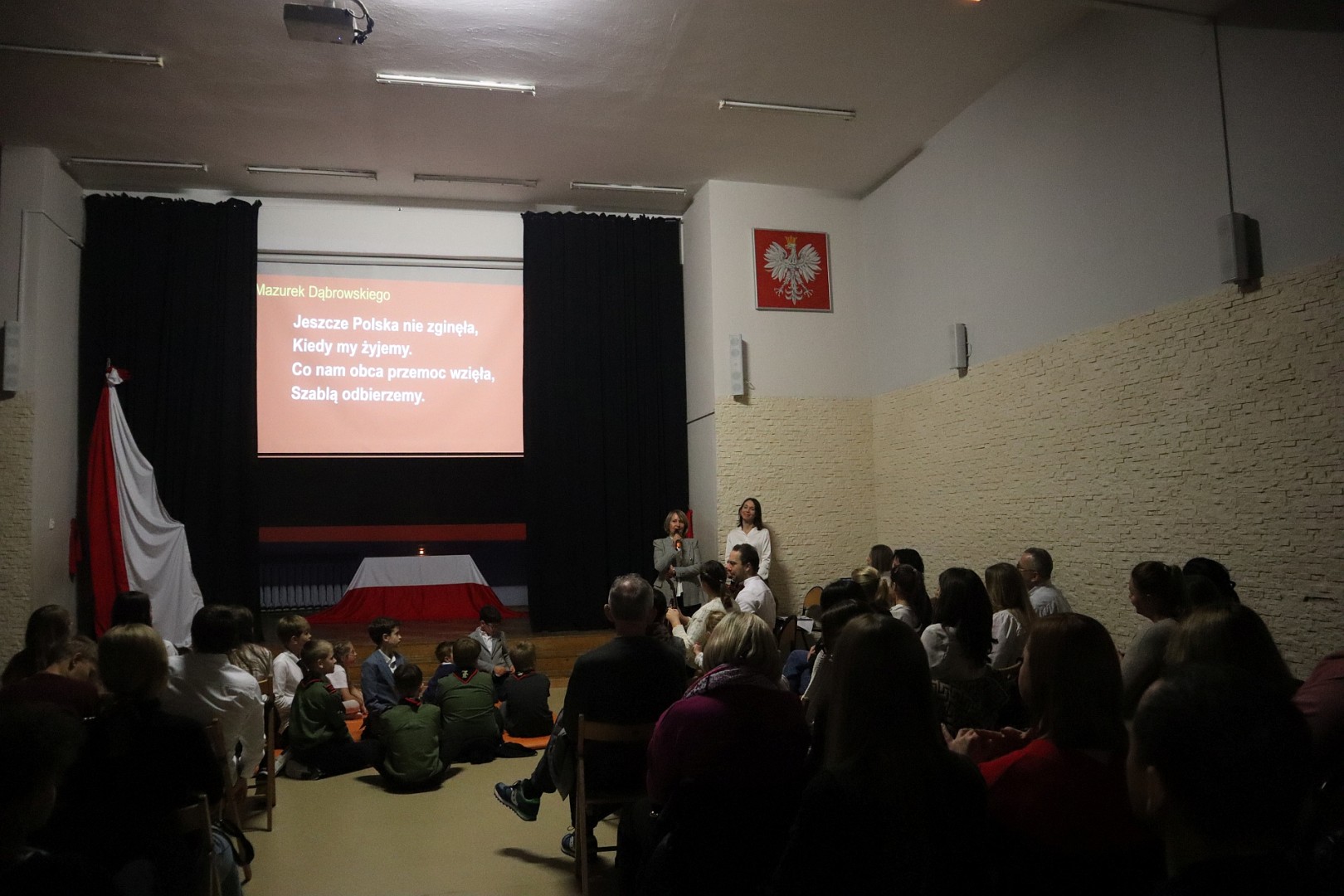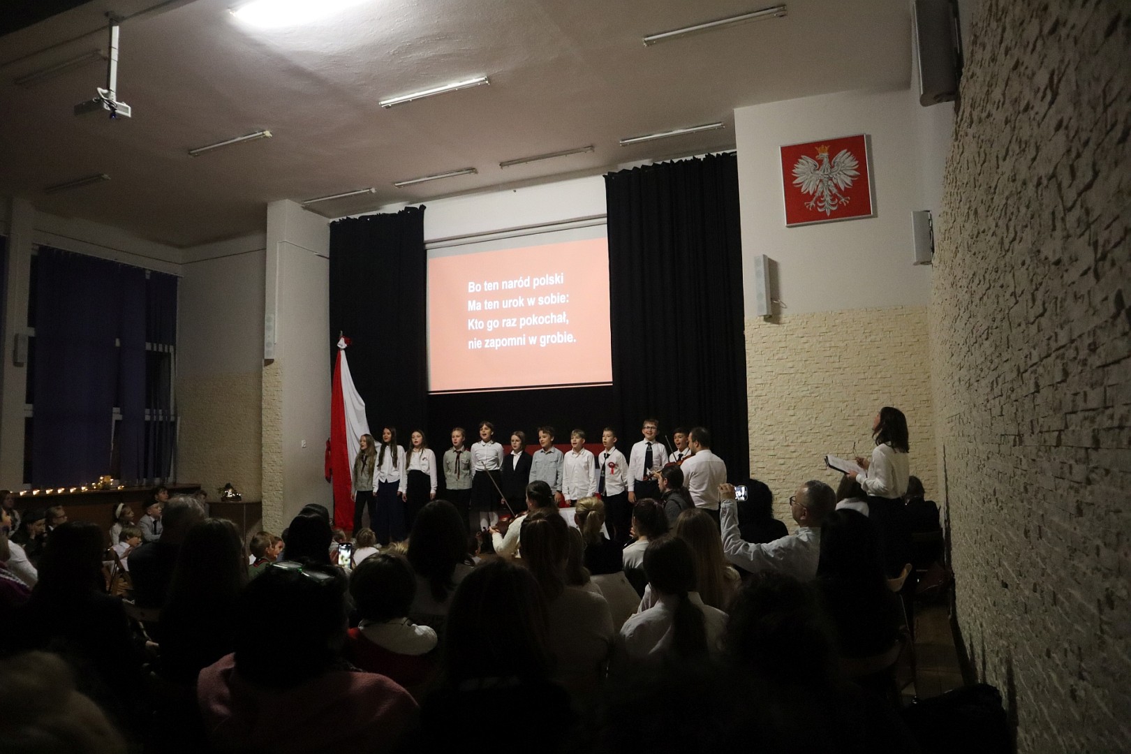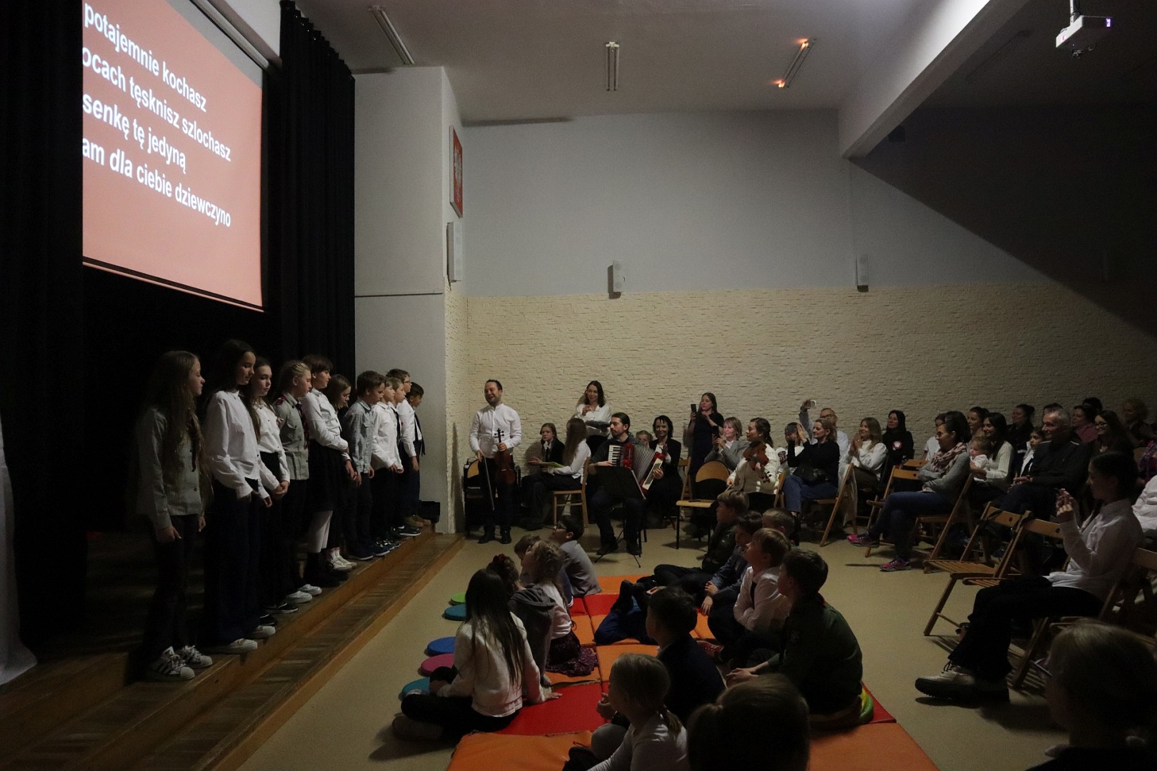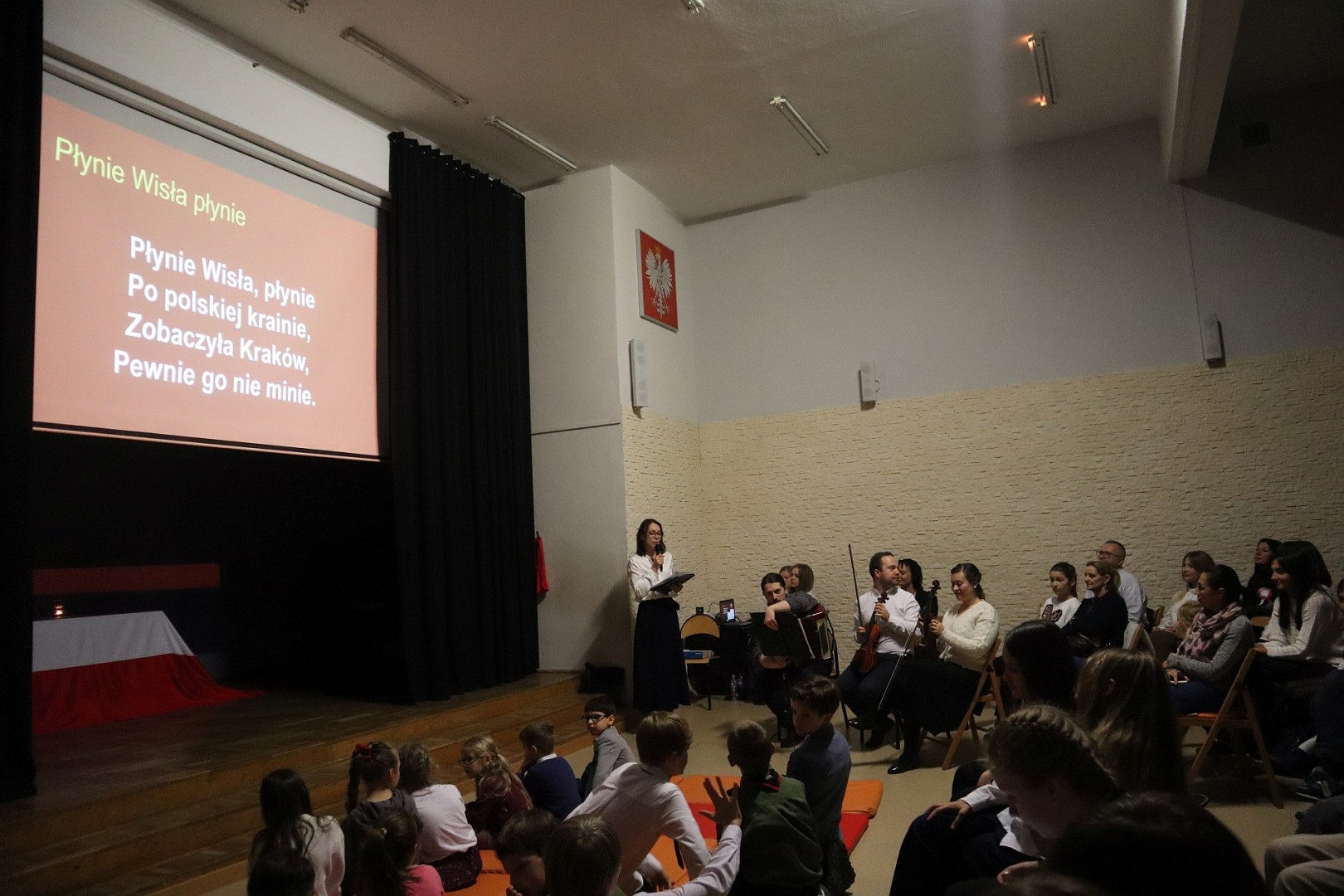 6 listopada odbyło się w naszej szkole wieczorne spotkanie, na którym wspólnym śpiewem patriotycznych pieśni i piosenek uczciliśmy nasze Narodowe Święto Niepodległości. Mimo późnej pory niezawodnie stawili się nasi wspaniali goście – uczniowie, ich rodzice, babcie i dziadkowie oraz nasi nauczyciele. Pięknym śpiewem wsparli nas chórzyści, prowadzeni przez pana Wiktora Ostrowskiego oraz zespół Żabiątka, którego opiekunem jest pani Katarzyna Niedziewicz-Sarba. Dziękujemy za wspaniały akompaniament pani Izabeli Byczek (skrzypce), panu Dawidowi Rzepce (akordeon) i panu Wiktorowi Ostrowskiemu (skrzypce). Było nastrojowo i wzruszająco.