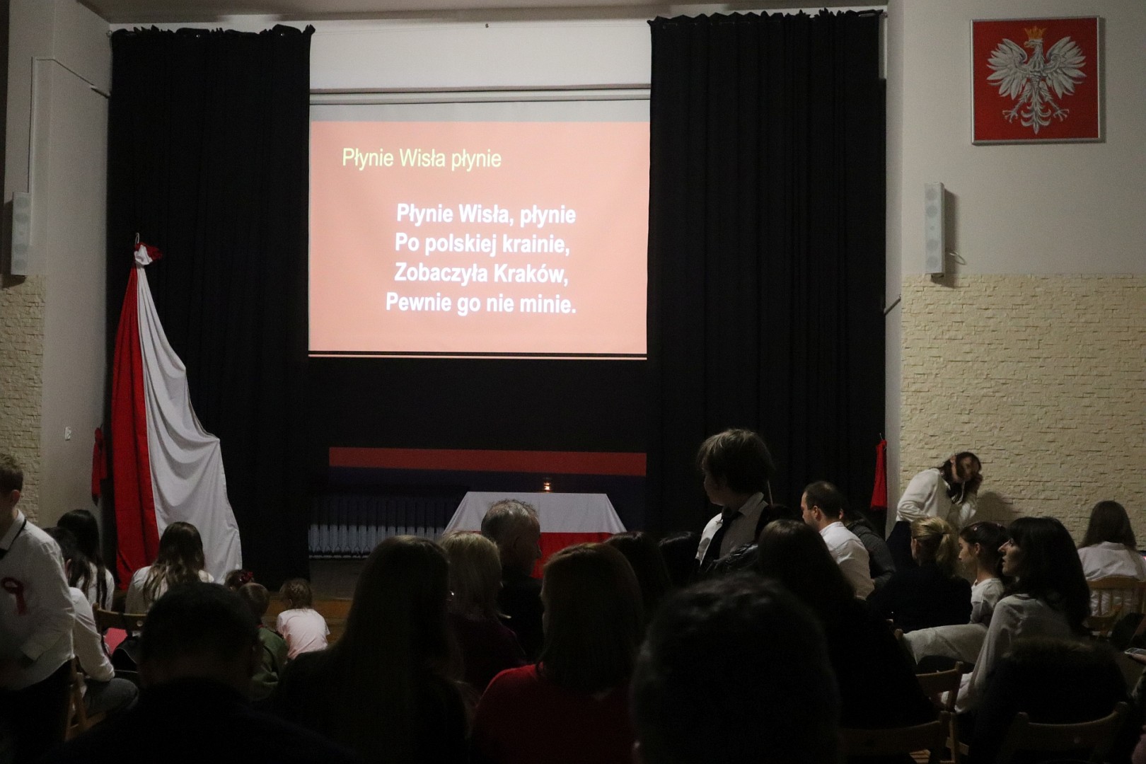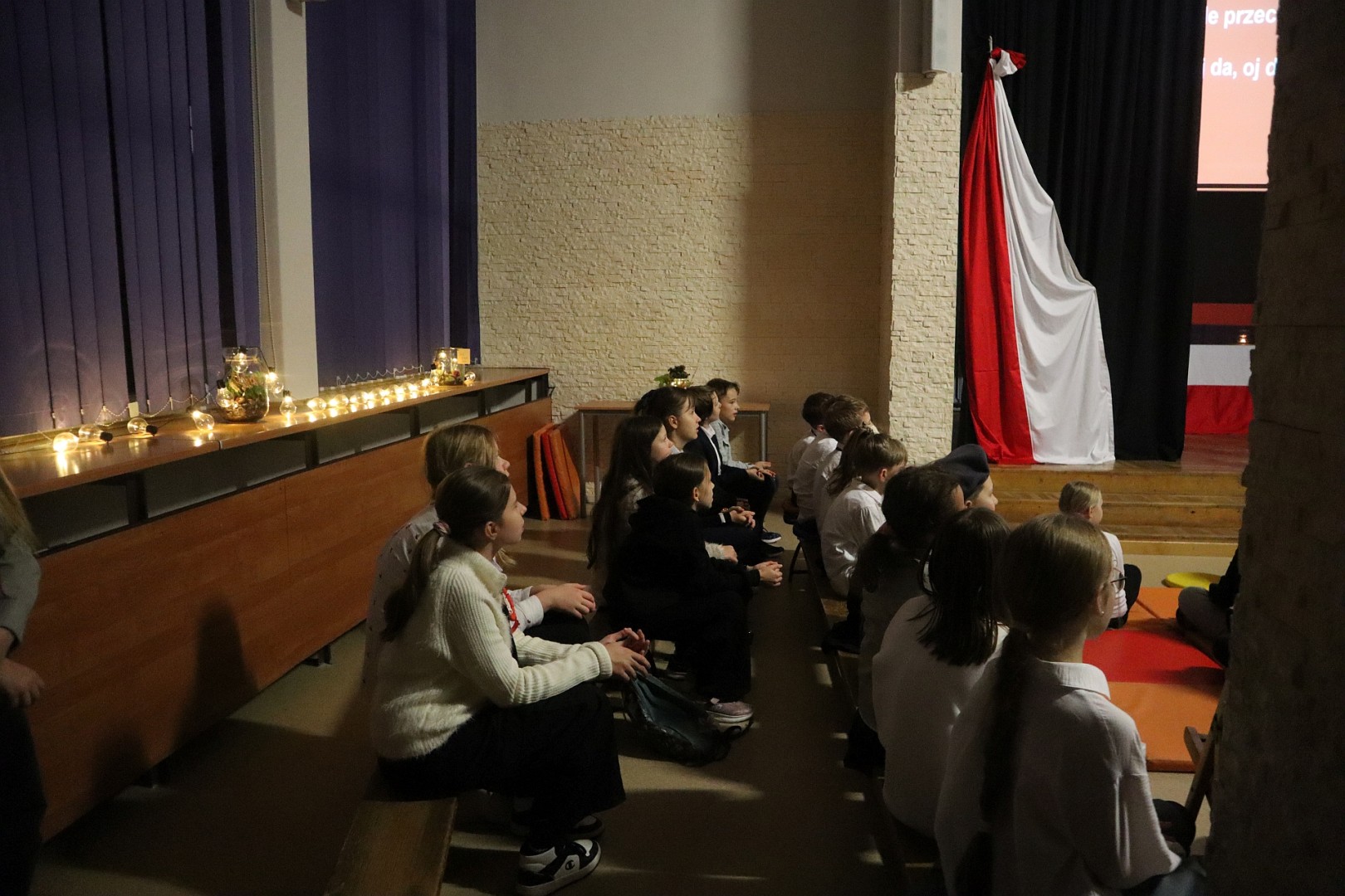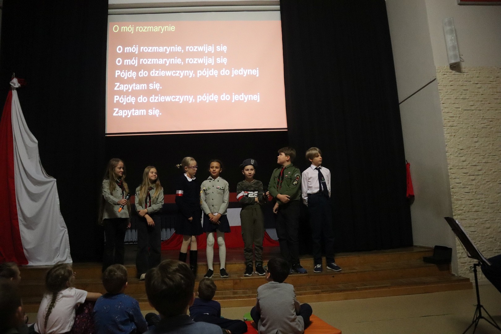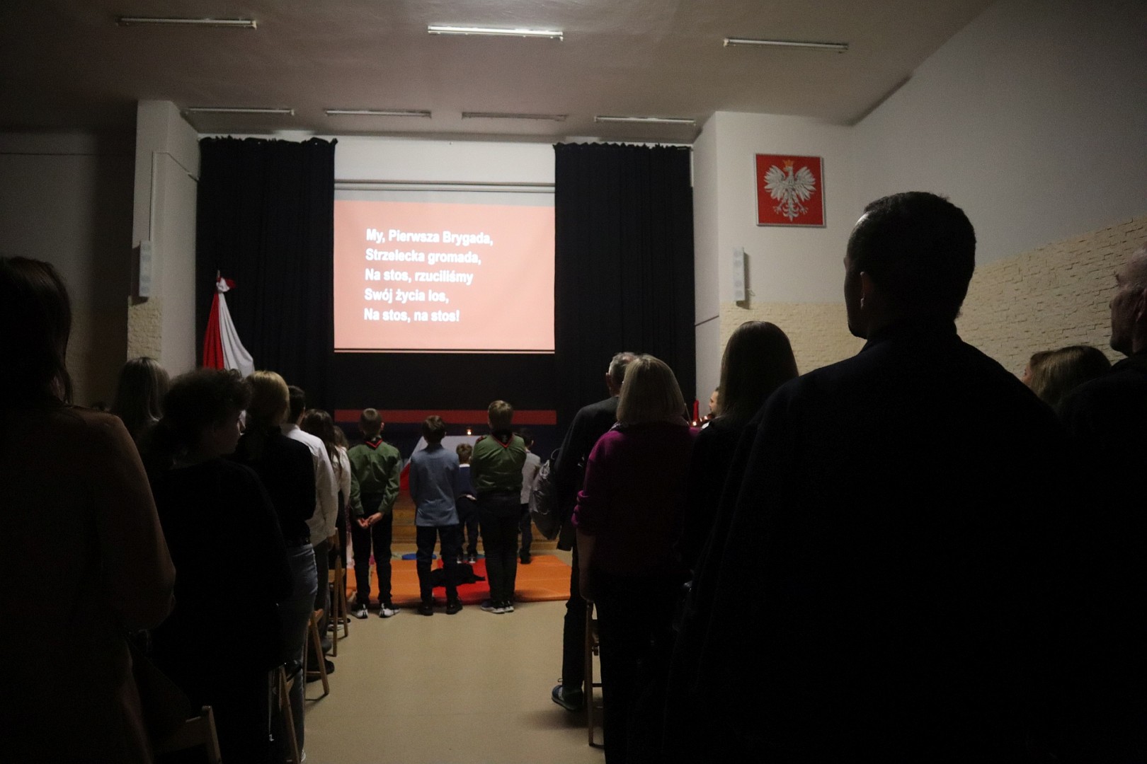 6 listopada odbyło się w naszej szkole wieczorne spotkanie, na którym wspólnym śpiewem patriotycznych pieśni i piosenek uczciliśmy nasze Narodowe Święto Niepodległości. Mimo późnej pory niezawodnie stawili się nasi wspaniali goście – uczniowie, ich rodzice, babcie i dziadkowie oraz nasi nauczyciele. Pięknym śpiewem wsparli nas chórzyści, prowadzeni przez pana Wiktora Ostrowskiego oraz zespół Żabiątka, którego opiekunem jest pani Katarzyna Niedziewicz-Sarba. Dziękujemy za wspaniały akompaniament pani Izabeli Byczek (skrzypce), panu Dawidowi Rzepce (akordeon) i panu Wiktorowi Ostrowskiemu (skrzypce). Było nastrojowo i wzruszająco.