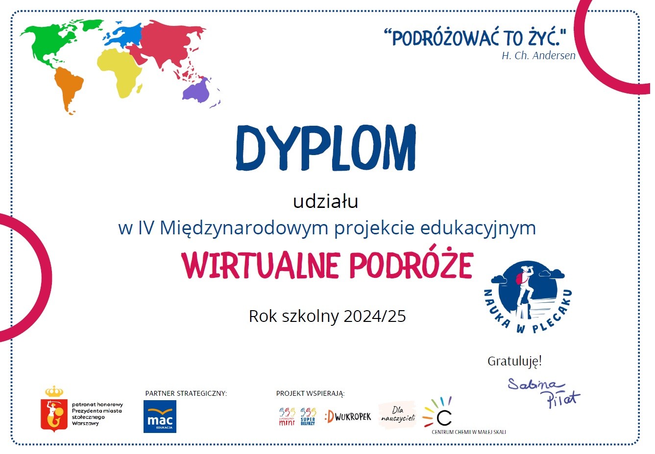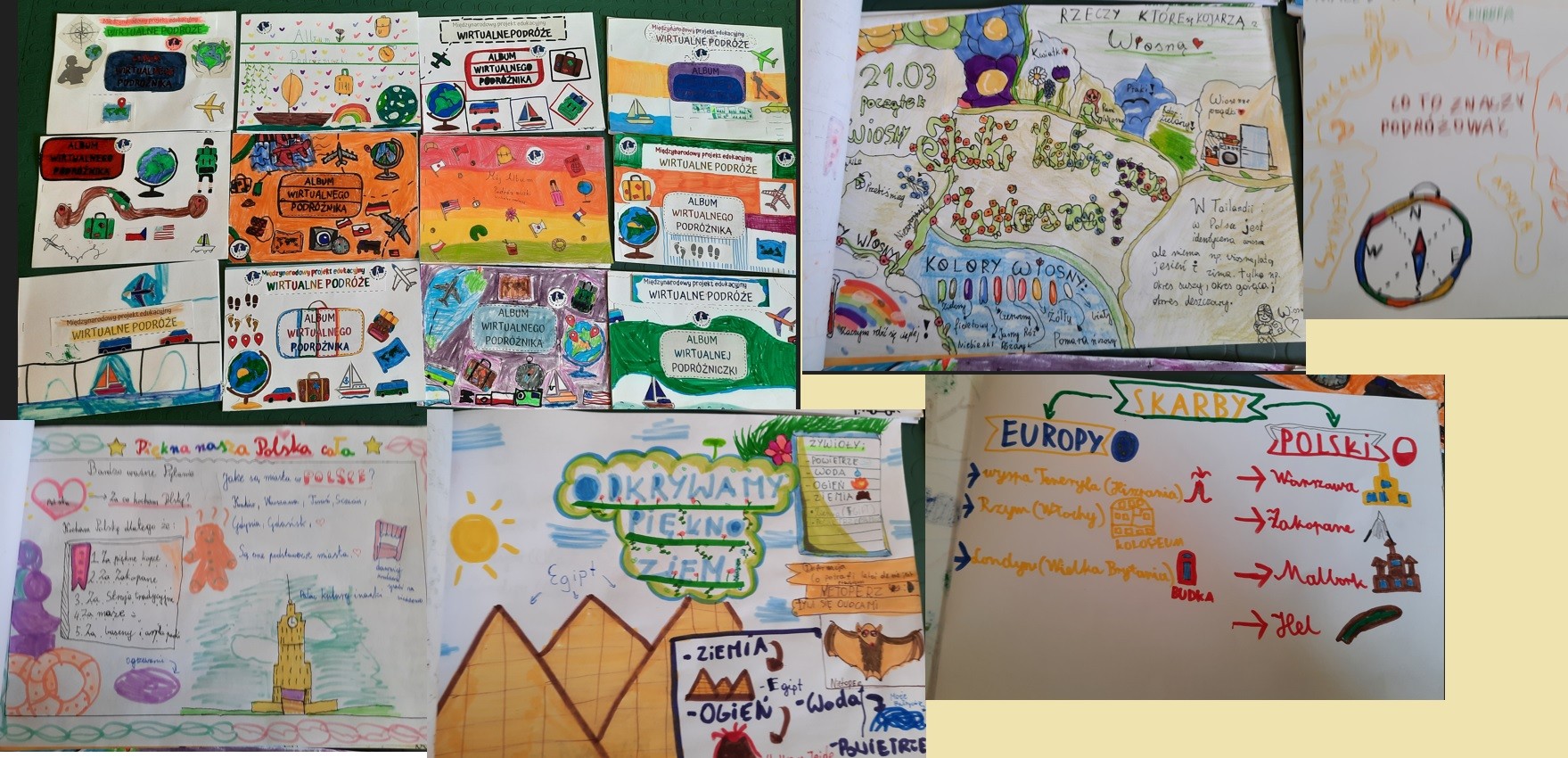 Uczniowie klasy 3a brali udział w Międzynarodowym projekcie edukacyjnym Wirtualne podróże. W ramach tego projektu przygotowali mapę świata, albumy wirtualnych podróżników oraz spotkanie podróżników. Wykonywali dodatkowe zadania poszerzając wiedzę o swojej miejscowości, o swoim kraju, o swoim kontynencie i o świecie. Dzieci miały lekcje w terenie pokazujące piękno najbliższej okolicy. Brały udział w pięciu lekcjach online na temat „Co to znaczy podróżować?”, „Piękna nasza Polska cała”, „Ile kolorów ma wiosna”, „Odkrywamy piękno Ziemi”, „Skarby Europy.”